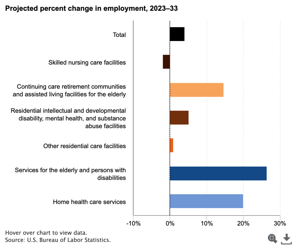 As a result, employment in services for the elderly, especially in home and community-based care industries, is projected to grow by 26.5 percent from 2023 to 2033, far above the projected growth of 4.0 percent for the nation overall.